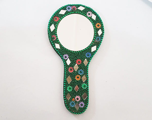 This beautiful glittering pink lac mirror is of 5.5 inch height and 3 inch width. It is beautifully engraved with a mirror of 2 inch diameter. It has a intricately crafted back with pink glitter mirror designs.