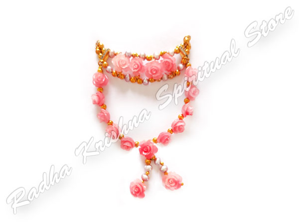 This beautiful dual string blooming Rose flowers shaped Vanmala or Vyjayanthimala necklace is made of man made coral. It has beautiful natural freshwater purple pearls and golden beads. It is fit for 12 inch standing deity size and is of approxiamtely 4 inch length.