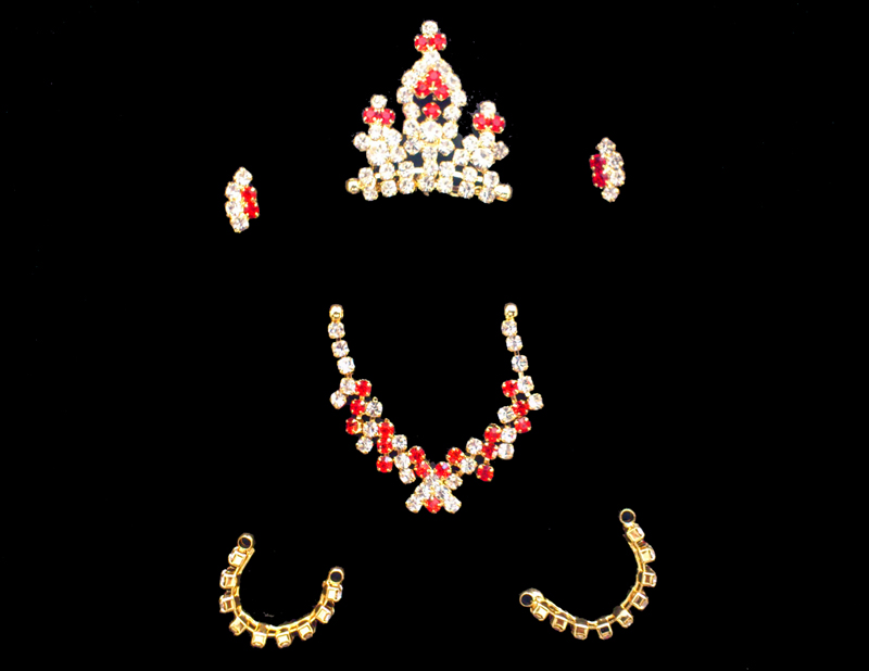 This beautiful small size metal sringaar set is inset with multi sized artificial white and red stones. It is fit for 3.5 to 4 inch idol of any deity.
