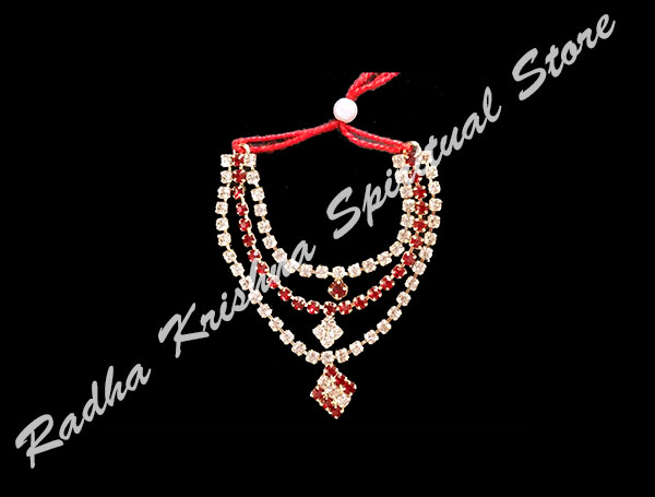 This triple layered golden metal necklace is inset with artificial white and red stones. It is of 2 inch in length and appropriate for a deity of approximate 10 inch height.