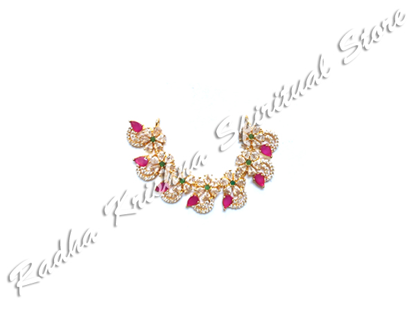 This beautiful Chokar Hasli style flexible american diamond metal Necklace is inset with semi curve shaped with flora and fauna shaped motif design. It is of 2 inch inner neck width. It is inset with red, green and white stones. Total hieght 1.5 inch.