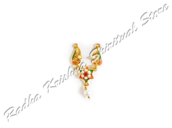 Diese wunderschöne Halskette Hasli ist mit weißen Perlen besetzt, golden mit Meenakari. Es ist 1.6 Zoll hoch und 1 Zoll breit. Es ist mit Shri Kanth von Thakorji / Laalan / Ladoogopal-Gottheiten geschmückt. Es wird im Allgemeinen als Pushtimarg Shringaar-Zubehör verwendet.