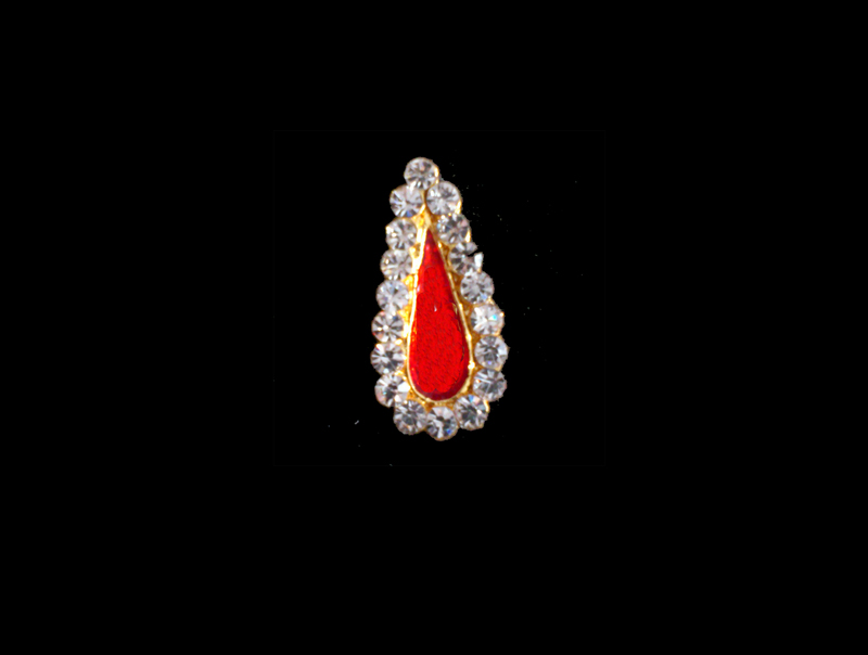 Dies ist der heilige Bindi auf der Stirn des Lords platziert, whrend bejeweling. Vermillion Farbe Spatenform Basis mit synthetischen Steinen verziert. Es ist 2.5 cm gro.