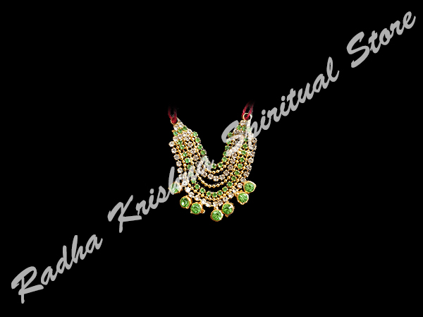 Diese schöne Metallkette Hasli ist mit bunten Steinen besetzt. Es ist 1.8 Zoll hoch. Es ist mit Shri Kanth von Thakorji / Laalan / Ladoogopal-Gottheiten geschmückt. Es wird im Allgemeinen als Pushtimarg Shringaar-Zubehör verwendet.