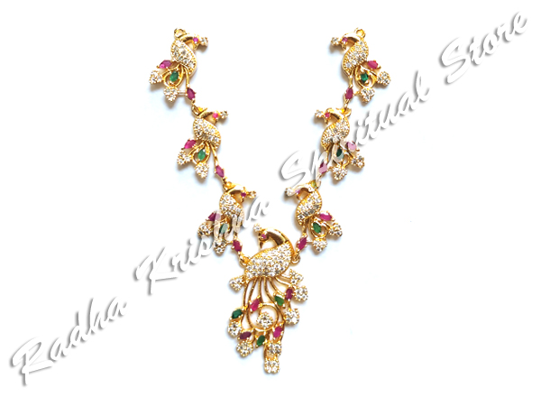 Diese goldene Metallkette mit reinen amerikanischen Diamanten ist aufwendig mit Pfauenmotiven gestaltet. Es ist 4 Zoll lang und mit weißen, smaragdgrünen und rubinroten amerikanischen Diamanten besetzt.