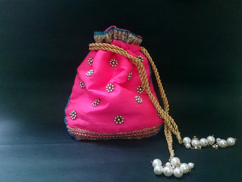 Ein Kordelzug Stil Geldbörse von gesteppten Süd-Seide. Es ist kunstvoll mit Perlen Stickereien und Spitzen bedeckt. Diese rosa Farbe Geldbörse kommt mit Schulterlänge Saiten und ist etwa 10 Zoll Länge und 8 Zoll Breite. Die Stickereien sowohl auf Vorder-und Rückseite, sowie die Tunnelzüge kommen mit hängenden Perlen gemacht.
