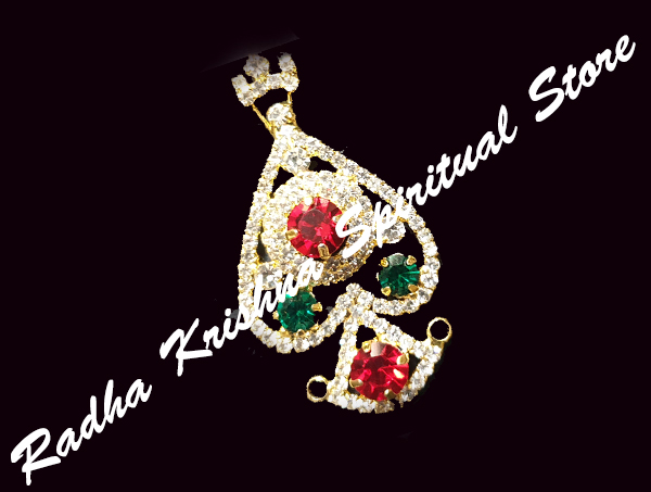 Dieses schöne goldene Mukutstück der Herzen und des abstrakten Entwurfs ist mit den großen künstlichen weißen, roten und grünen Steinen eingelassen. Es ist 5 cm mal 3 cm groß. und passend, auf dem Kopf von kleinen Gottheiten zu schmücken.