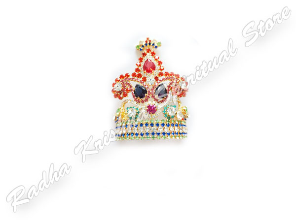 A golden color metal base beautiful spade and curvy design crown inset with artificial multi color stones is of 3 inch ear to ear fit for a 12 inch deity.