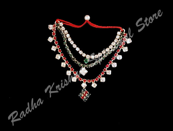 This beautiful triple layered golden metal necklace is inset with artificial white, green and red stones. It is of 2 inch in length and appropriate for a deity of approximate 10 inch height.