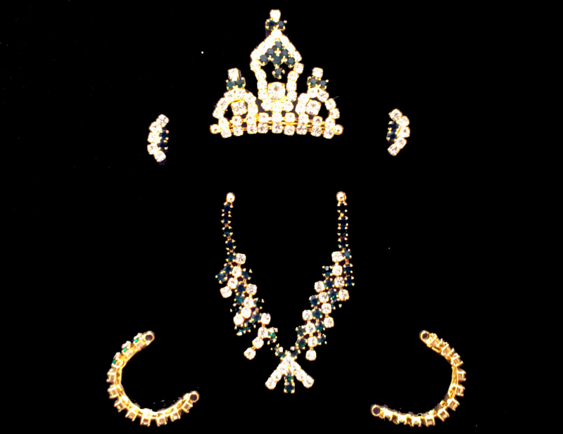 This intricate beautiful small size metal sringaar set is inset with multi sized artificial white and green stones. It is fit for 4 to 6 inch idol of any deity.