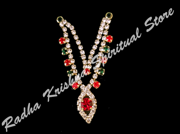 A golden color metal base beautiful floral spade elegant design necklace inset with multi sized artificial white, red, green color stones fit for a 4 inches Lord deity.