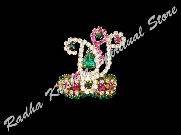 A golden color metal base beautiful filament and ambi paisley design crown. It is inset with artificial pink and green color stones fit for a 4 inches deity.