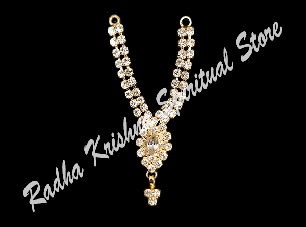 This beautiful double layered maple shaped golden metal necklace is inset with artificial white stones.It is of 2 inch length in height.