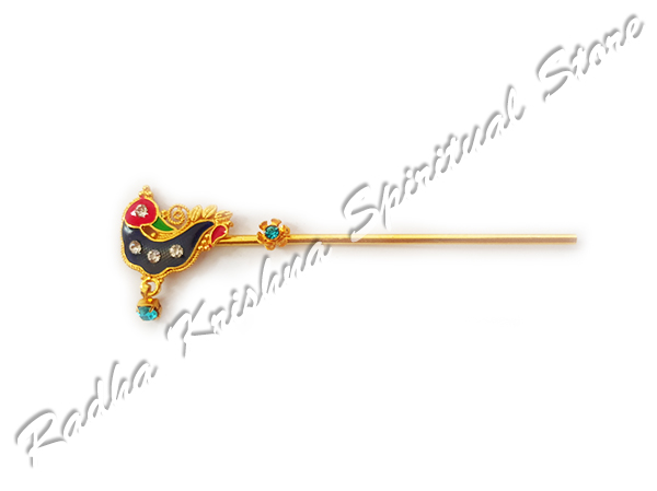 This lord Krishna flute is 3.4 inches long with thickness of 2mm, made of metal in golden colour with artifical white gems arranged in baby peacock feather and a small floral shape along with hangings forming an intricate design.