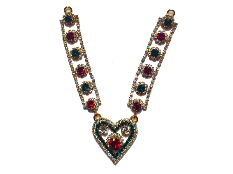 This beautiful hearts and abstract design golden small size metal necklace is inset with multi sized artificial white, red and green stones. It is fit for 10 inch idol.