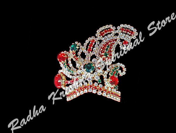 A golden color metal base beautiful intricately petal shaped ambi paisley design crown. It is inset with artificial red and green color stones fit for a 4 inches deity.