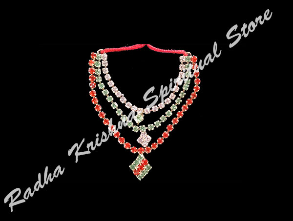 This triple layered golden metal necklace is inset with artificial white, orange and green stones. It is of 2 inch in length and appropriate for a deity of approximate 10 inch height.